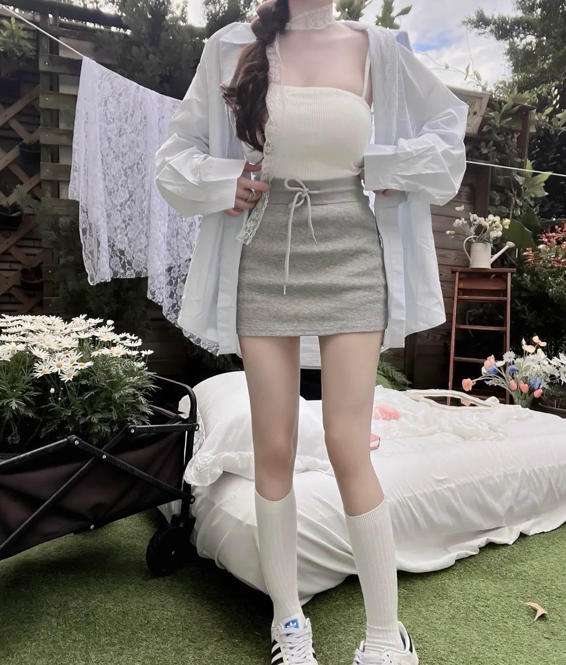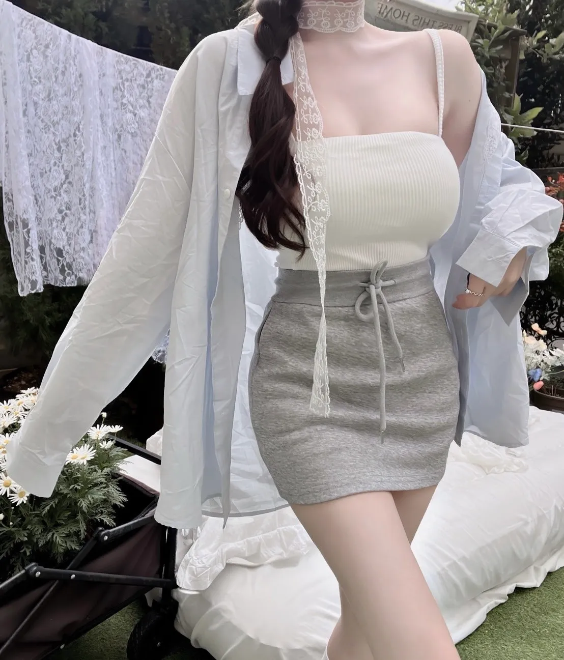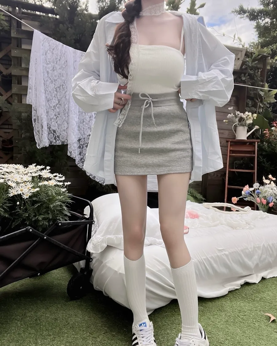 抽繩高腰拉鍊裙