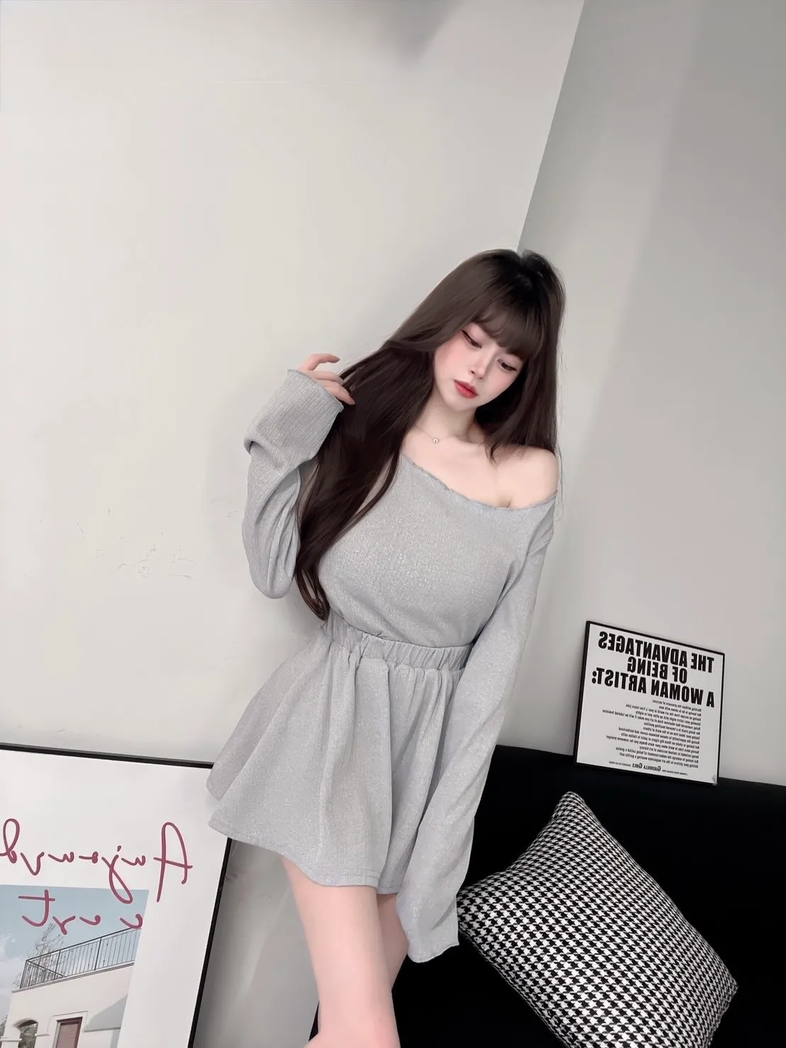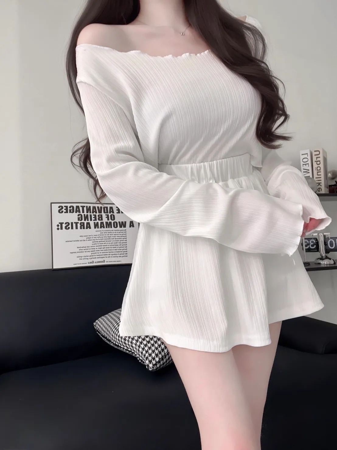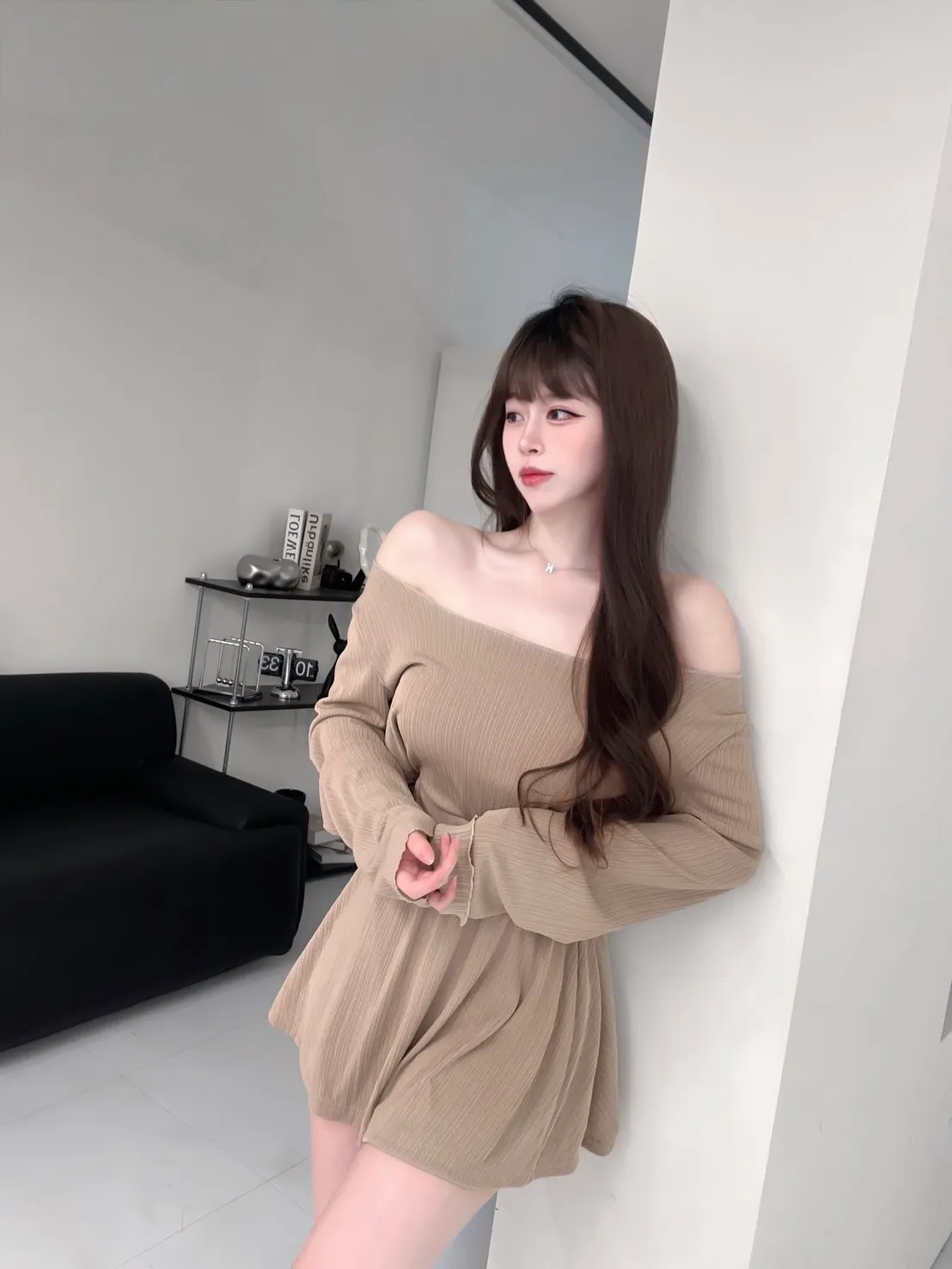 斜肩設計露出鎖骨線條