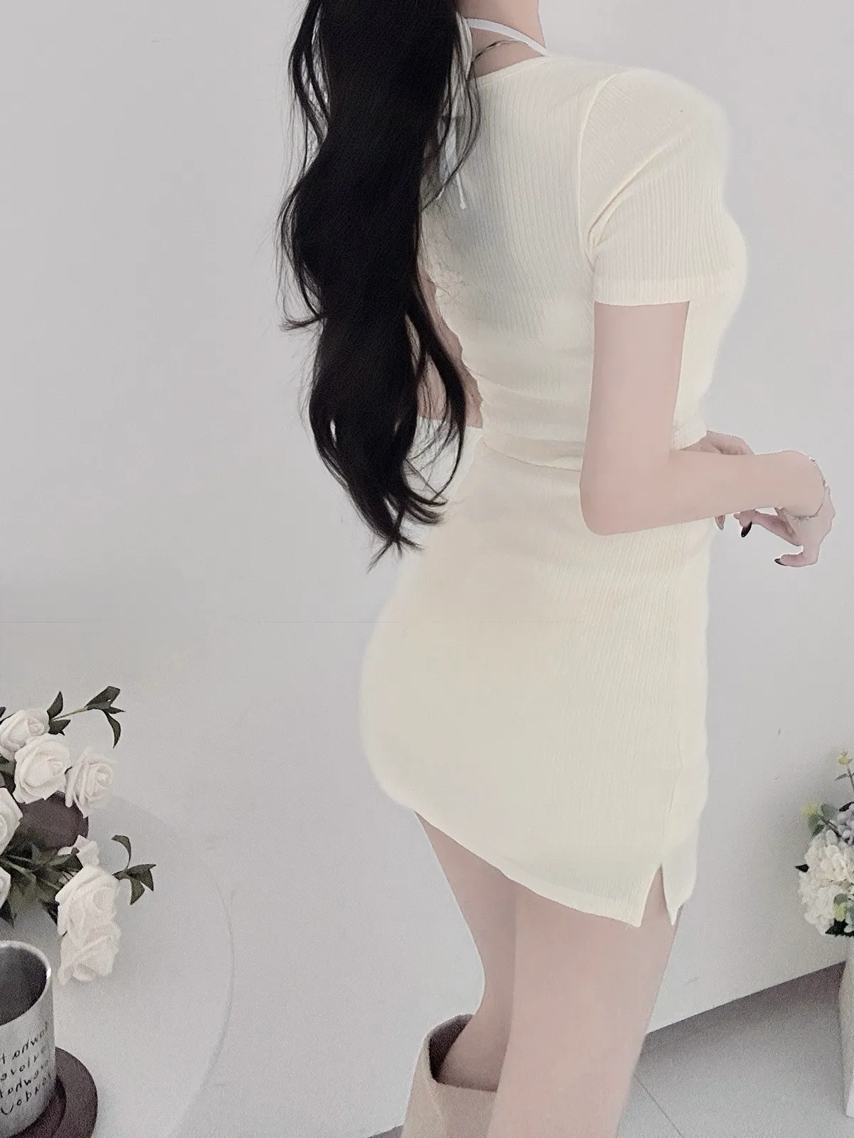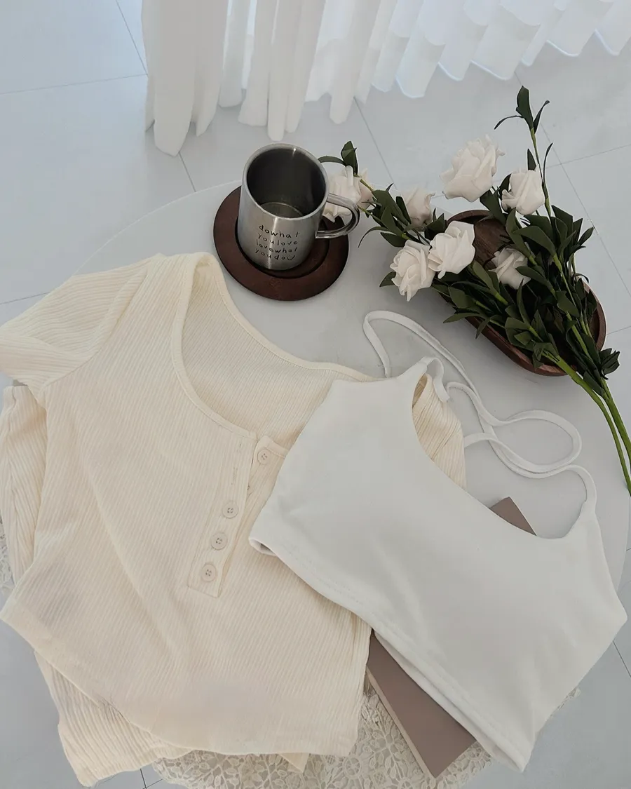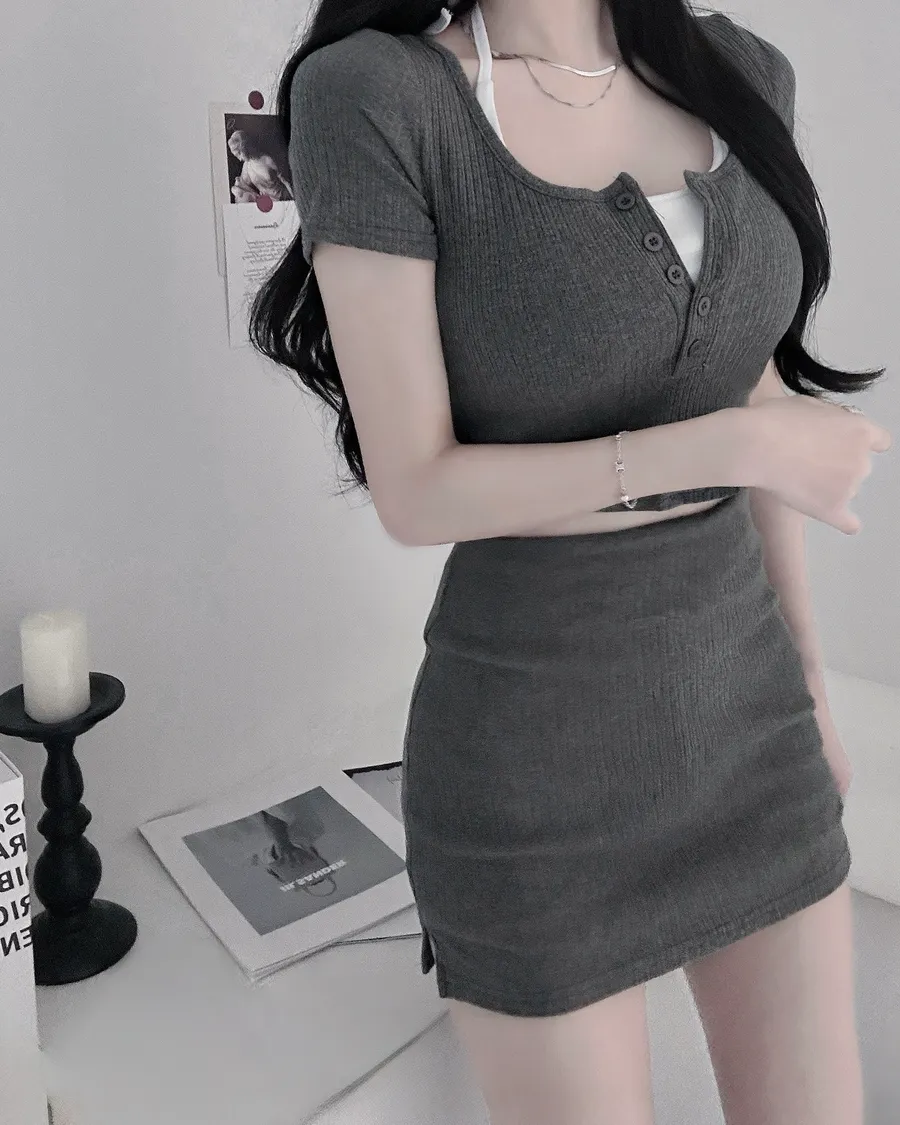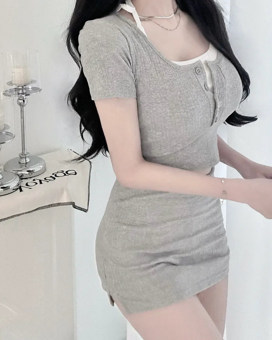 綁繩內杯小可愛➕圓領排扣坑條薄短袖➕裏褲側開衩包臀裙3set