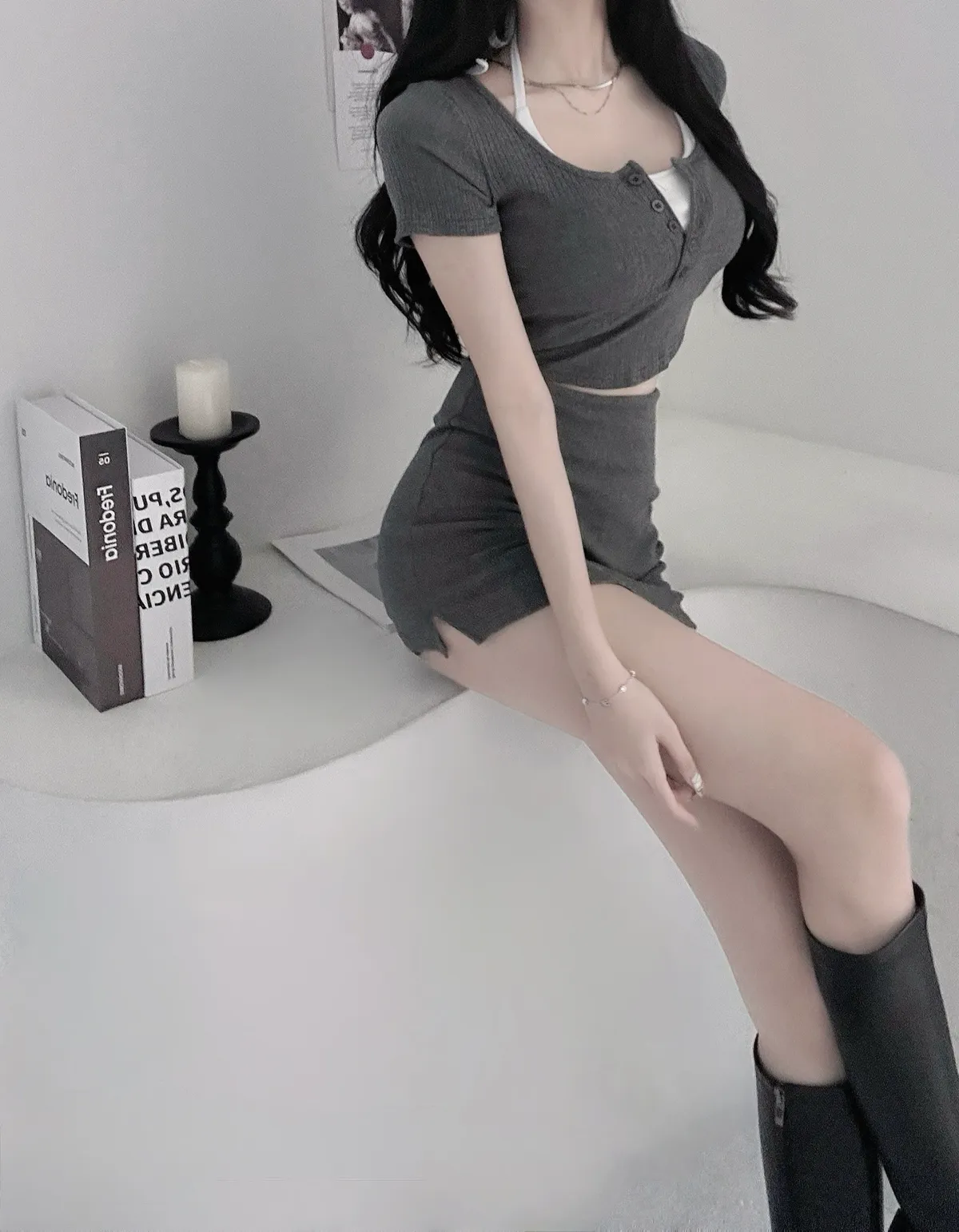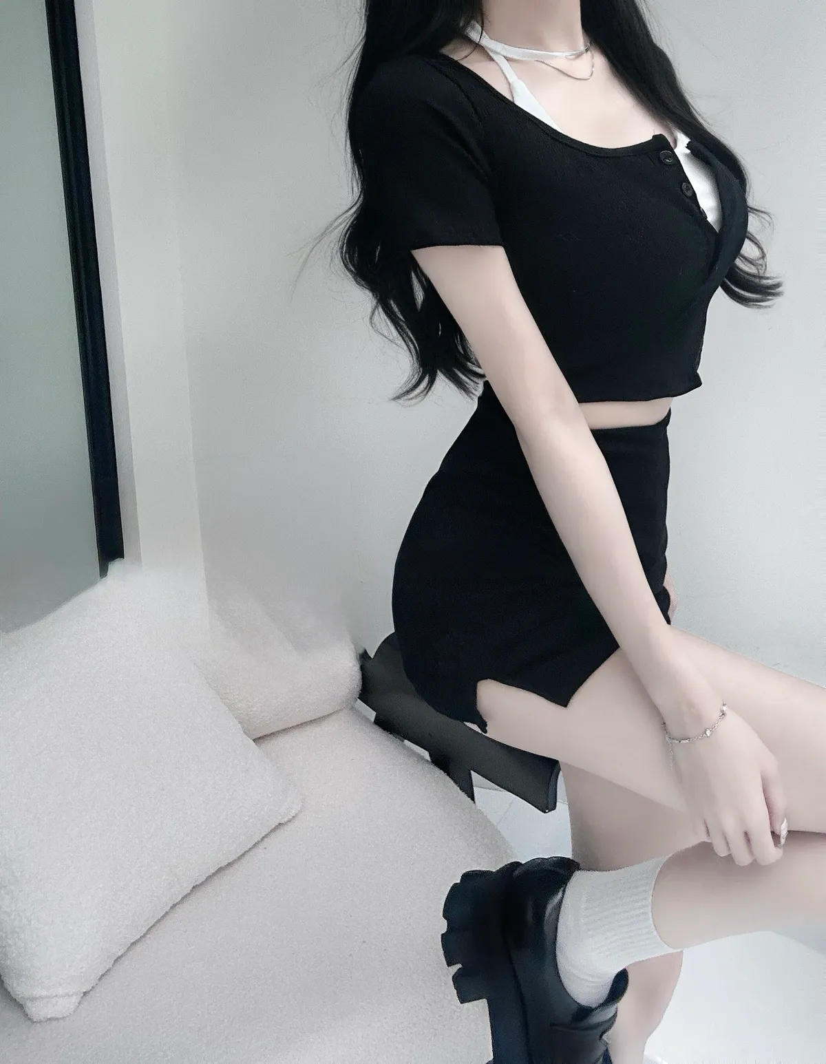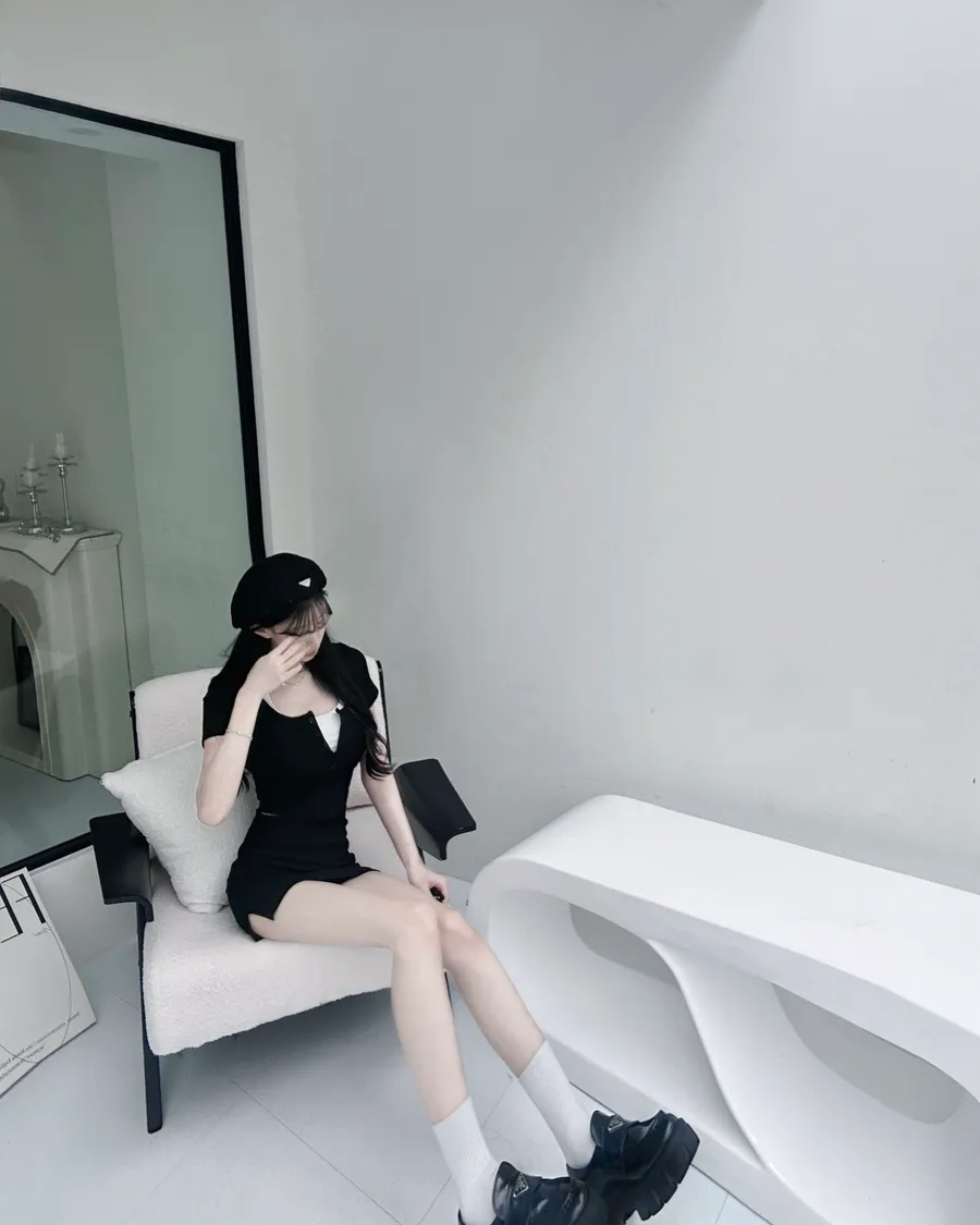 綁繩內杯小可愛➕圓領排扣坑條薄短袖➕裏褲側開衩包臀裙3set